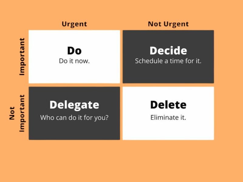 Đây là phương pháp giúp bạn tách bạch giữa cái "quan trọng" và cái "khẩn cấp". Hãy chia công việc thành 4 nhóm: Quan trọng và khẩn cấp (Làm ngay), Quan trọng nhưng không khẩn cấp (Lên lịch), Không quan trọng nhưng khẩn cấp (Ủy quyền), và Không quan trọng cũng không khẩn cấp (Xóa bỏ). Bí quyết của những người thành công là dành 80% thời gian cho nhóm "Quan trọng nhưng không khẩn cấp" để ngăn chặn các khủng hoảng trong tương lai.